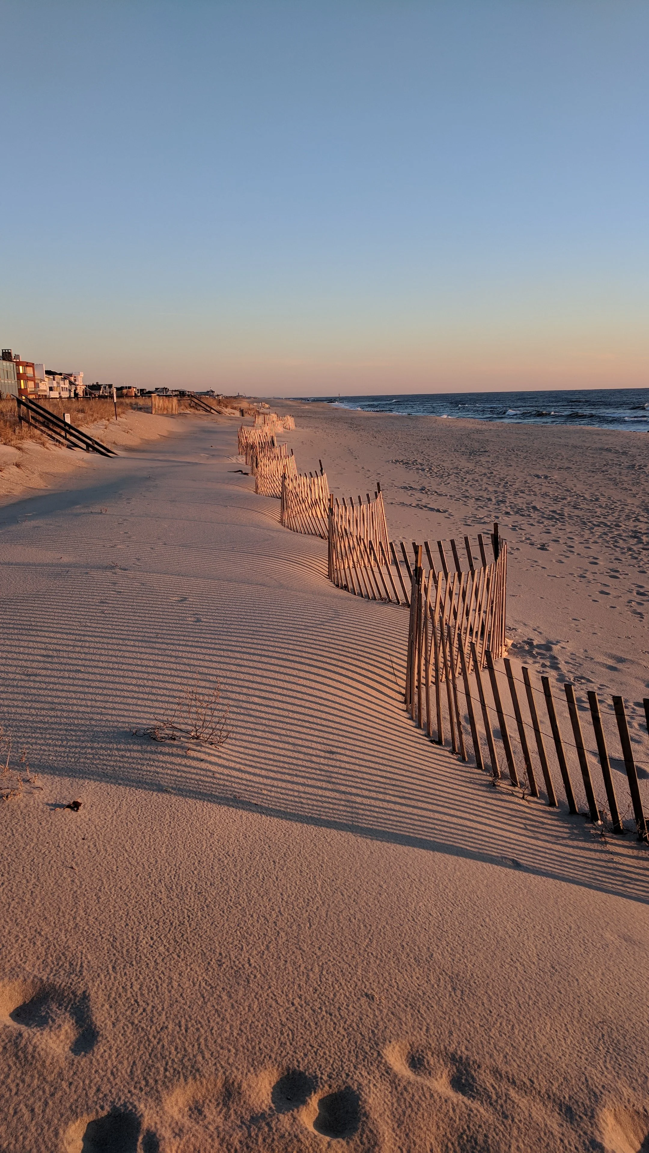 The dune fence hasn't really changed much over my lifetime. Slats about 4 inches wide by 4 feet high, strung on twisted wire, that rust away over time. The gap seems unchanged, letting about half the air through. Many artists use them to give us a signal that we are at the Jersey Shore or the New England Coast.
