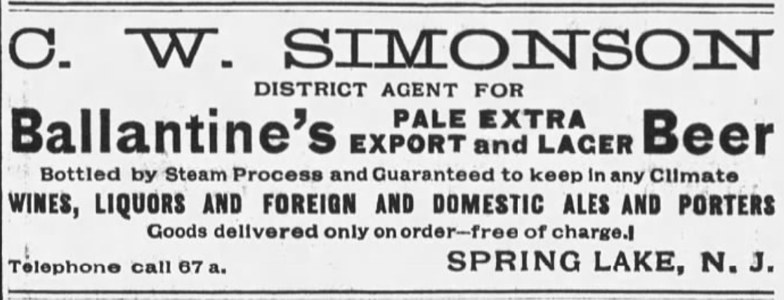 Starting in 1894, Charles W. Simonson ran his bottling business in Spring Lake, on Jersey Ave near the railroad tracks, with his brother Edward. For $150 licencing fee, he could deliver the product he purchased from Ballantine to the hotels and cottage owners. By 1898, Edward had branched out on his own and started a similar distributor in Freehold.