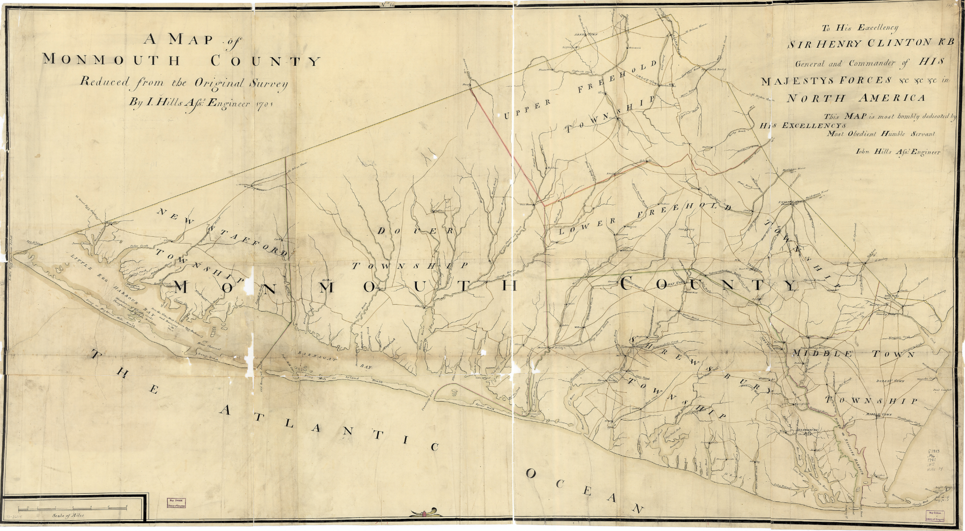 Monmouth included modern Ocean County. Rack Brook is noted where the Wreck Pond Inlet is today. The Manasquan inlet was further north than its current position.